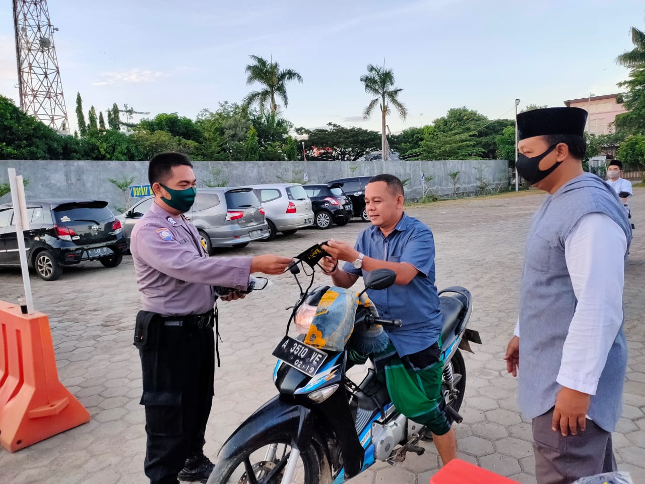 Personel Bhabinkamtibmas Polres Cilegon Bagikan Masker Kepada Masyarakat yang Melakukan Sholat Idul Fitri